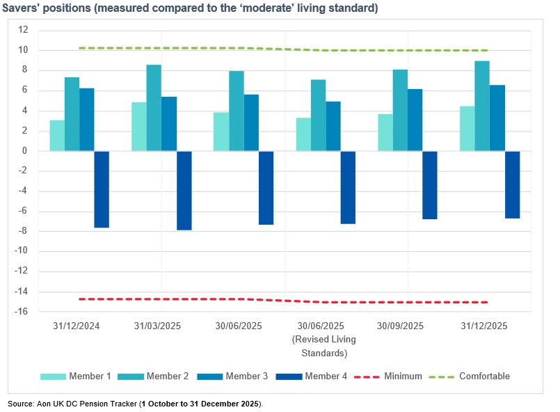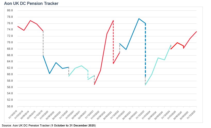 Over the quarter (October to December 2025), the Aon UK DC Pension Tracker rose, which suggests the expected future living standard in retirement provided by defined contribution (DC) savings was higher than at the end of the previous quarter.