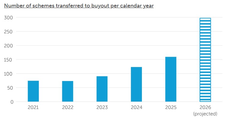 2025 marks another milestone year, with almost 160 schemes completing buyout – a 30% increase on 2024. Insurers anticipate this upward trajectory will accelerate, with the number of buyouts projected to almost double in 2026, when around 300 schemes are expected to reach buyout.