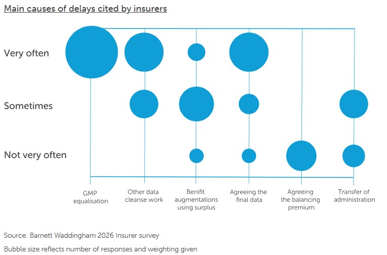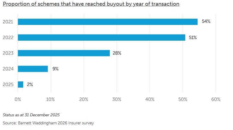 Source: Barnett Waddingham 2026 Insurer survey This is perhaps not surprising given the sharp increase in the number of schemes transacting with insurers over recent years. However, it brings sharper focus to a key question: how quickly are schemes progressing from buy-in to buyout, and how does that compare with the number of new buy-ins being written? The post-transaction bottleneck – are things improving?