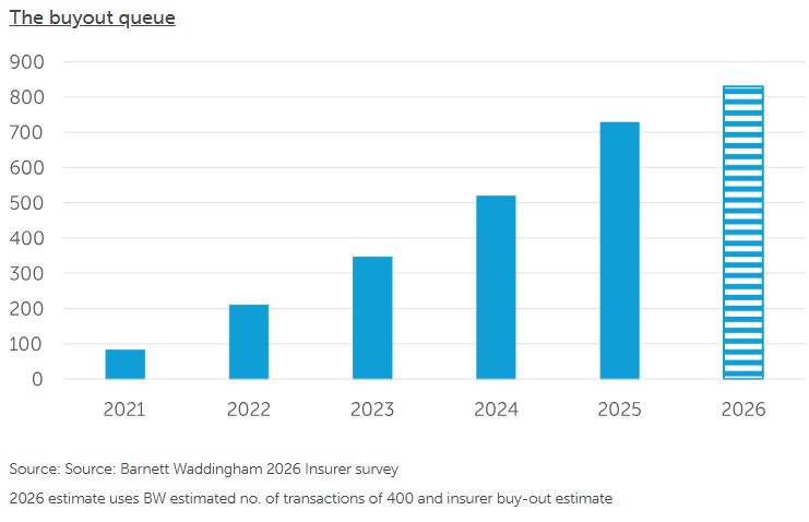 This highlights the ongoing challenge: while buy-ins are becoming increasingly common, the final steps to buyout and wind-up still require substantial time and preparation. Three years to buyout is becoming accepted as the current industry norm, as reflected by The Pensions Regulator in its recent modelling on the evolution of DB schemes. There are, however, some encouraging signs. Almost a fifth of transactions written in 2023 and 2024 have already moved through to buyout, demonstrating that schemes can progress quickly, within one to two years, when they are well prepared and advanced with their data and benefits work. This aligns with the patterns we are seeing across our own cases, where a quarter of our schemes in this 2023-2024 cohort have reached buyout. Looking at older transactions, our focus on preparedness means all of the schemes BW advised that transacted in 2021 have already bought out, compared with only 54% across the wider market. The buyout pipeline is set to keep growing in 2026. While insurers project an increase in buyout capacity, Barnett Waddingham’s estimates suggest buy-in activity will surpass 400 transactions this year. This means that 2026 is likely to be another year with more buy-ins than buy-outs, adding further volume to the pipeline of schemes progressing toward full buy-out and eventual wind-up. As a result, the buy-out queue is projected to grow to more than 800 schemes.