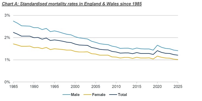Mortality trends have varied by age and sex. Although mortality in 2025 reached record lows at pensioner ages, mortality for males aged 45-64 remained above the 2015-2019 average.