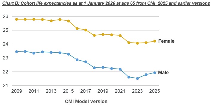 Chart B shows the progression of cohort life expectancy at age 65 in successive versions of the CMI Model. The figures for CMI_2025 are around eighteen months lower than in the first version, CMI_2009.