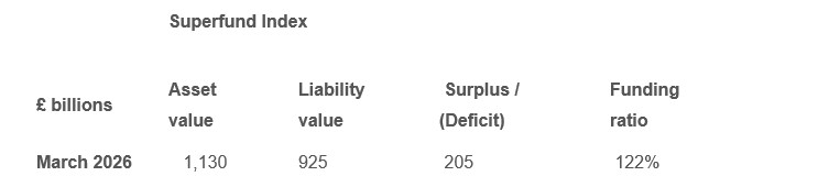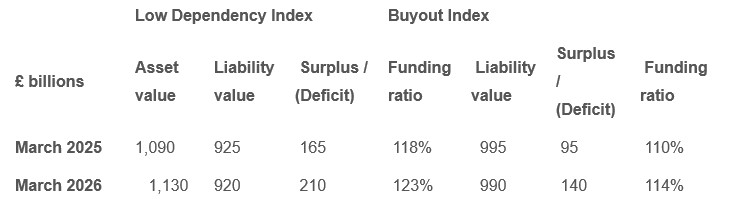 As of 31 March 2026, PwC estimates that UK DB schemes held assets totalling £1,130 billion against liabilities of £920 billion on a low dependency measure. This equates to an overall surplus of £210 billion and a funding level of 123%.
