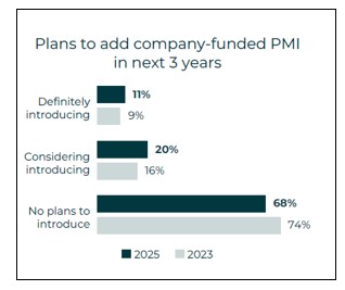 The percentage of organisations without PMI but with definite plans to introduce it rose from 9% in 2023 to 11% in 2025, with those considering it increasing from 15% to 20%. Those with no PMI plans on the horizon fell from 74% to 68%, reflecting a growing interest.