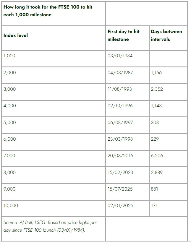“It’s only been 171 days since the FTSE 100 hit 9,000, so exceeding 10,000 at the start of 2026 makes it a record-breaking leap. Previously, the fastest jump in blocks of 1,000 happened when the FTSE 100 went from 5,000 to 6,000, which took 229 days in the late 90s.