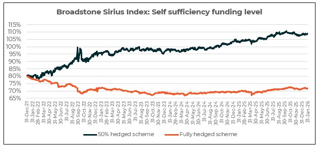 The Broadstone Sirius Index – a monitor of how various pension scheme strategies are performing on their journeys to self-sufficiency – posts its latest update. The Broadstone Sirius Index reports its update for January 2026 with both modelled schemes ending the month slightly ahead from where they started it, building on the positive progression over 2025. The funding level of the fully hedged scheme increased from 71.6% at the end of December 2025 to 71.8% at the end of January 2026. The funding level of the 50% hedged scheme increased from 108.4% at the end of December 2025 to 108.9% at the end of January 2026, reaching ever closer to the record high of 110.5% during October 2025.