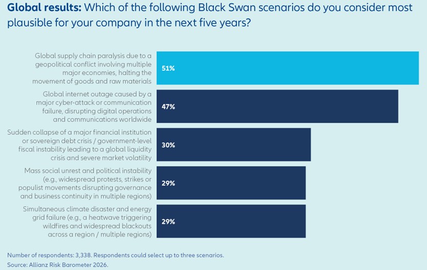 Despite seeming predictable in hindsight, Black Swans are unexpected or unforeseen events that are highly disruptive and economically damaging. Examples include the 9/11 attacks of 2001 in the US, the 2008 global financial crisis, and the Covid-19 pandemic. Allianz Research estimates cumulative global GDP losses from the pandemic between 2020 and 2023 to be in the region of US$12trn. In addition to the huge financial and business costs, such events typically have long-lasting implications, resulting in geopolitical and societal shifts that continue many years after the initial event. According to new Allianz Risk Barometer analysis, more than half of the 3,000+ respondents (51%) identify a global supply chain paralysis due to a geopolitical conflict as the most plausible Black Swan scenario globally which could impact their company in the next five years. Fear of a global internet outage ranks second (47%) which reflects the increasing awareness of cyber and artificial intelligence (AI) risks among business leaders.