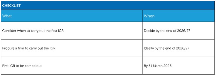 Administering authorities will need to commission a periodic IGR within every valuation period, with the first one due by 31 March 2028. There is flexibility on timing, so reviews do not need to take place at the same time every three years.