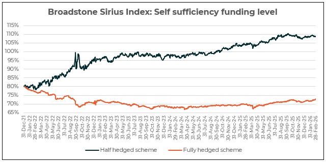 The Broadstone Sirius Index – a monitor of how various pension scheme strategies are performing on their journeys to self-sufficiency – posts its latest update. The Broadstone Sirius Index reports its update for February 2026 with the fully hedged scheme outperforming the half-hedged scheme in the face of falling gilt yields. The funding level of the fully hedged scheme increased by 1.1 percentage points from 71.8% at the end of January to 72.9% at the end of February. This marks its strongest funding position since September 2022. The funding level of the 50% hedged scheme fell back slightly from 108.9% at the end of January to 108.7% at the end of February remaining broadly similar to levels seen at the start of the year.
