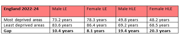 “Even more striking is the discrepancy in healthy life expectancy – both men and women in the least deprived areas of England can expect to enjoy, on average, around twenty years more in healthy life expectancy than their counterparts in the most deprived areas.