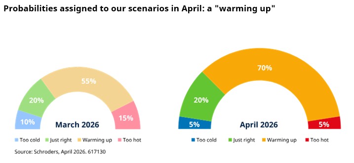 Source: Schroders Global Unconstrained Fixed Income team 20 April 2026, for illustrative purposes only. The “‘too cold”’ scenario would see the Federal Reserve (Fed) cutting 4+ times in 2026, 2-3 cuts for “‘just right”’, while in “‘warming up”’ the Fed is only cutting once or is on hold. Finally, in a “‘too hot”’ scenario the Fed is moving back towards hikes in 2026, because inflation is becoming problematic again.