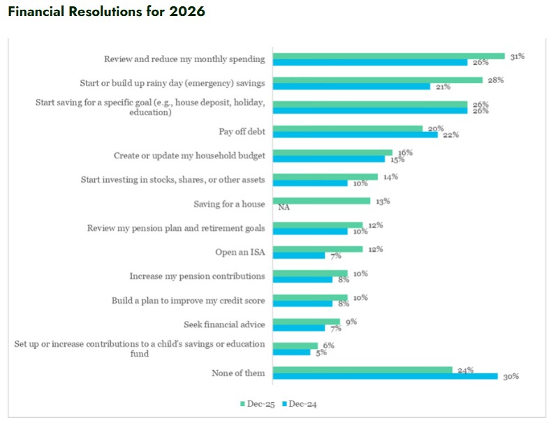 In its latest research, Pensions UK asked working adults about their financial New Year’s resolutions for 2026. The findings reveal that reviewing and reducing monthly spending remains the most common goal, rising to 31% from 26% last year. Building up rainy day savings has also grown in importance, with 28% planning to do so compared to 21% in 2025. Younger savers under 35 are leading the way, with 31% prioritising emergency funds compared to 24% among those aged 55 and over.