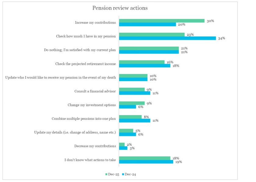 While around one in ten continue to plan to review their pension plan and retirement goals (12%) and increase contributions (10%) as part of their resolutions, the real change comes when people consider what they would do if they undertook a pension review.
