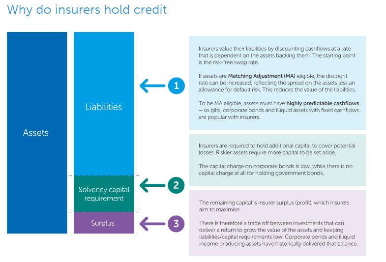 Ahead of a buy-in, DB schemes have often adopted credit exposure to mirror the allocations of insurers. In principle, investing like an insurer should help to hedge the risk of adverse movements in buy-in pricing. To understand why this relationship is beginning to weaken, it is first worth revisiting why insurers have typically held bonds within their portfolios: