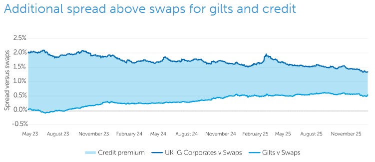 Credit spreads have tightened, with the spread on UK Corporate Bonds reaching near record lows. The compensation for taking on corporate default risk – and, for insurers, a higher capital charge relative to gilts – is far below historical levels.