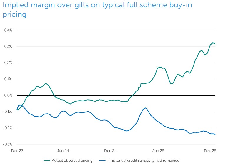 "Since 2024, the correlation between insurer pricing and UK investment grade spreads has been negative (-0.6), having been positively correlated (+0.5) in the two years prior."