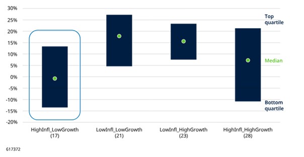 It is worth asking if there are economic and market conditions that have been necessary to support equities in these more favourable outcomes, to aid investment decision-making today. The number of stagflation-years when a positive real return was generated was small, at only eight (1967, 1971, 1975, 1979, 1980, 2006, 2007, 2009), so we need to be highly wary of making bold claims. But that is not the aim here. The data shows that, even in this small sample, there have been a diverse range of backdrops (Figure 2) that still allow for some conclusions to be drawn: