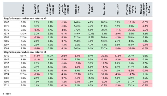 When assessed relative to cash, equities come out better, outperforming cash more often than not (in 10 of the 17 stagflation-years). This may be a riskier than normal time for stocks, but it can also be a risky time to sit in cash. Furthermore, statistical analysis of how stocks have performed relative to cash in stagflation-years compared with the rest of the time indicates there is no significant (in a statistical sense) difference. In other words, any difference could be due to random noise rather than a meaningful relationship. There does not need to be an earlier crash or rate cuts for stocks to perform well