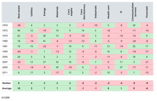 IT and communication services also both have a poor track record. This is due to a combination of demand weakness alongside rising supply costs, but also valuation impacts. IT companies, especially growth-oriented ones, tend to have high price-to-earnings (P/E) ratios because investors expect strong future earnings. The higher interest rates that usually accompany stagflation reduce the present value of future earnings, hitting growth stocks like IT companies particularly hard. This is also relevant for today’s crop of communication services companies. One potential difference for today’s big growth companies is that many are highly profitable and have global scale. Although they have increased borrowing significantly to finance capex, most also have strong balance sheets e.g., interest cover is higher than the average investment grade bond issuer.