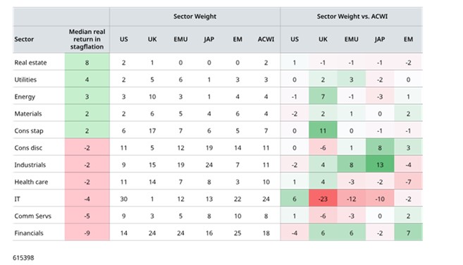 Figures are shown on a rounded basis. Stagflation defined as both real GDP growth below the previous 10-year average and CPI inflation above its 10-year average. Median real returns are as set out in Figure 4. US = MSCI USA index, UK = MSCI UK index, EMU = MSCI EMU Index, JAP = MSCI Japan index, MSCI ACWI = MSCI All Country World Index. Sector weights as at 28 February 2026. Source: LSEG Datastream and Schroders.